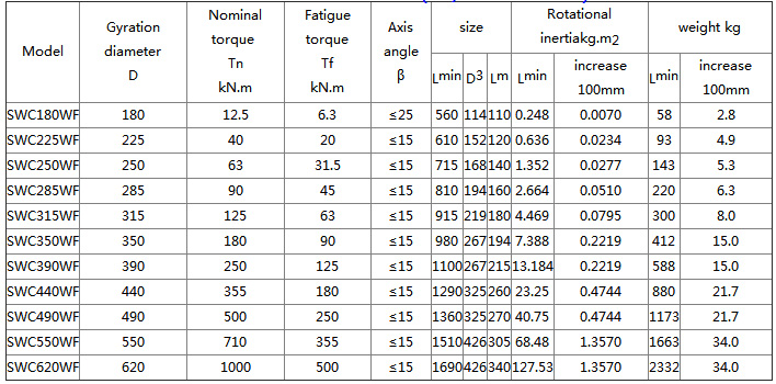 Features and application of SWC-WF universal coupling: connecting shaft drive of two different axes, can not buffer and reduce vibration, adopting integral fork head structure, bearing fixing without bolts, avoiding loose bolt breakage and easy maintenance. It has long service life, high reliability, large bearing capacity and large inclination. It can work under the condition of β≤5°~25°. Suitable for rolling machinery, lifting and transportation, construction machinery, petroleum machinery and other heavy machinery