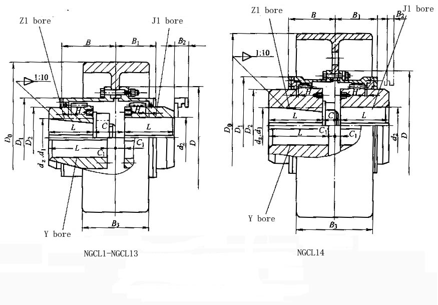 Features and applications: With a small amount of axial offset compensation performance, can not buffer, reduce vibration. The outer shape is small, theoretically, the transmission torque is large, and it needs lubrication and sealing, but the noise is large and the price is expensive, and it is used for connecting the horizontal two coaxial line shaft transmission. It is used to connect two horizontal coaxial lines under low speed and heavy load conditions, such as metallurgical machinery and heavy machinery. It is not suitable for high-speed, high-precision shafting transmission. It is not suitable to use frequent starting and reverse rotation. For use with brakes, for metallurgical machinery and heavy machinery requiring braking components NGCL type - basic type with brake wheel; NGCLZ type - with brake wheel connected intermediate shaft type; ![]() ![]() |