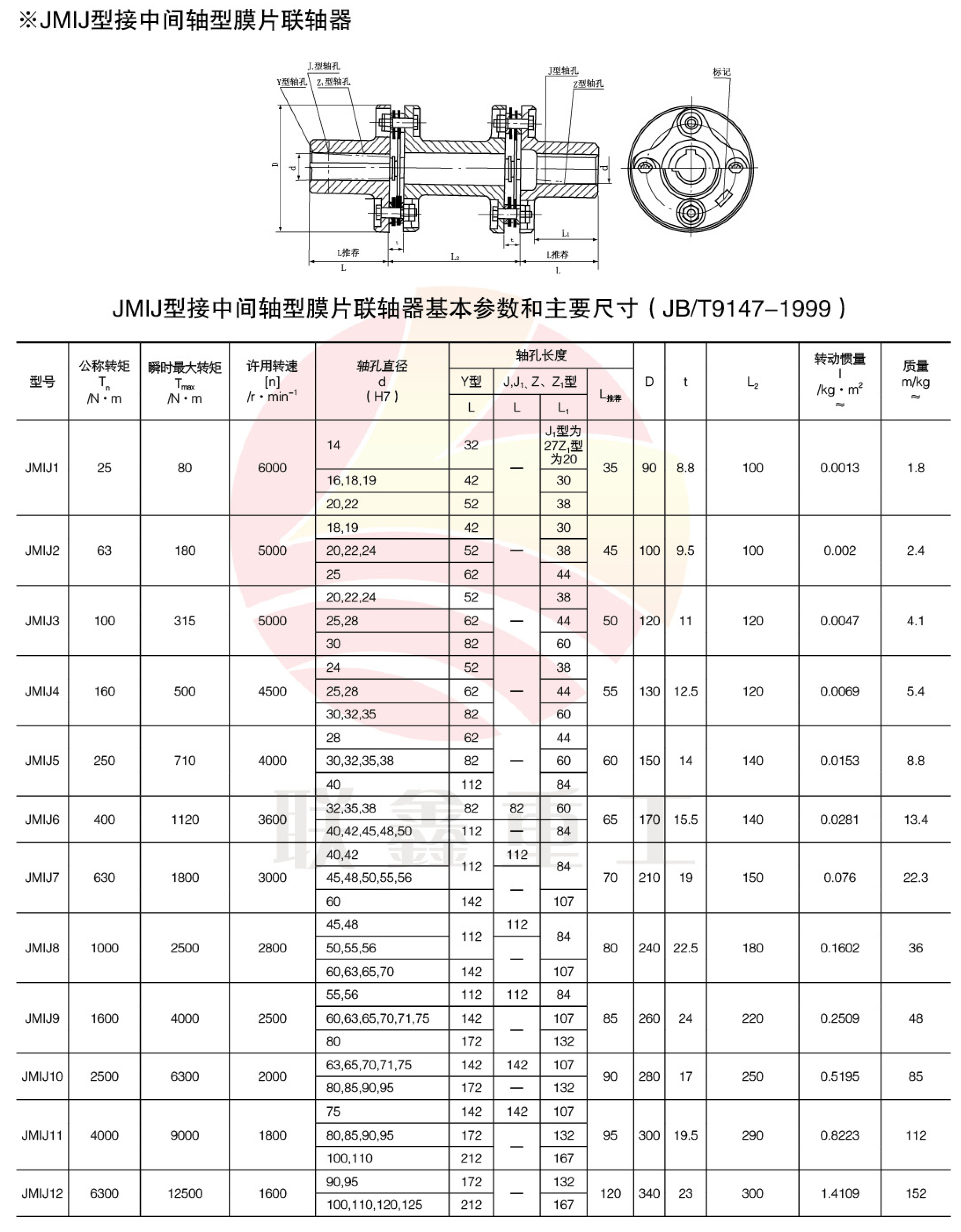 JMIJ膜片聯(lián)軸器 特點及應(yīng)用場合:與金屬彈性元件撓性聯(lián)軸器相比,具有機械強度高,承載能力大、質(zhì)量輕結(jié)構(gòu)尺寸小、傳動效率和傳動精度高,可靠性好、裝拆方便等特點。適用于中、高速、大轉(zhuǎn)矩軸系傳動。與鼓形齒式聯(lián)軸器相比,具有無相對滑動,不需潤滑,使用壽命長、無噪聲、結(jié)構(gòu)簡單等特點.可部分代替鼓形齒式聯(lián)輔器。不受溫度和油污影響。具有耐酸、堿,防腐蝕的特點??捎糜诟邷亍⒌蜏睾陀杏?、有水和腐蝕介質(zhì)的工況環(huán)境.適用于各種機械裝置載荷變化不大的軸系傳動,通用性極強,工業(yè)發(fā)達(dá)國家已普遍采用,是我國重點推廣應(yīng)用的高性能撓性聯(lián)軸囂,高精度膜片聯(lián)軸器可用于高速工況。膜片聯(lián)軸器與齒式聯(lián)軸器相比,沒有相對滑動,不需要潤滑、密封,無噪聲,基本不用維修,制造較方便,可部分代替齒式聯(lián)軸器。膜片聯(lián)軸器在工業(yè)發(fā)達(dá)國家應(yīng)用已很普遍,在實際應(yīng)用中一般采用接中間軸型,以提高兩軸線偏移補償性能。