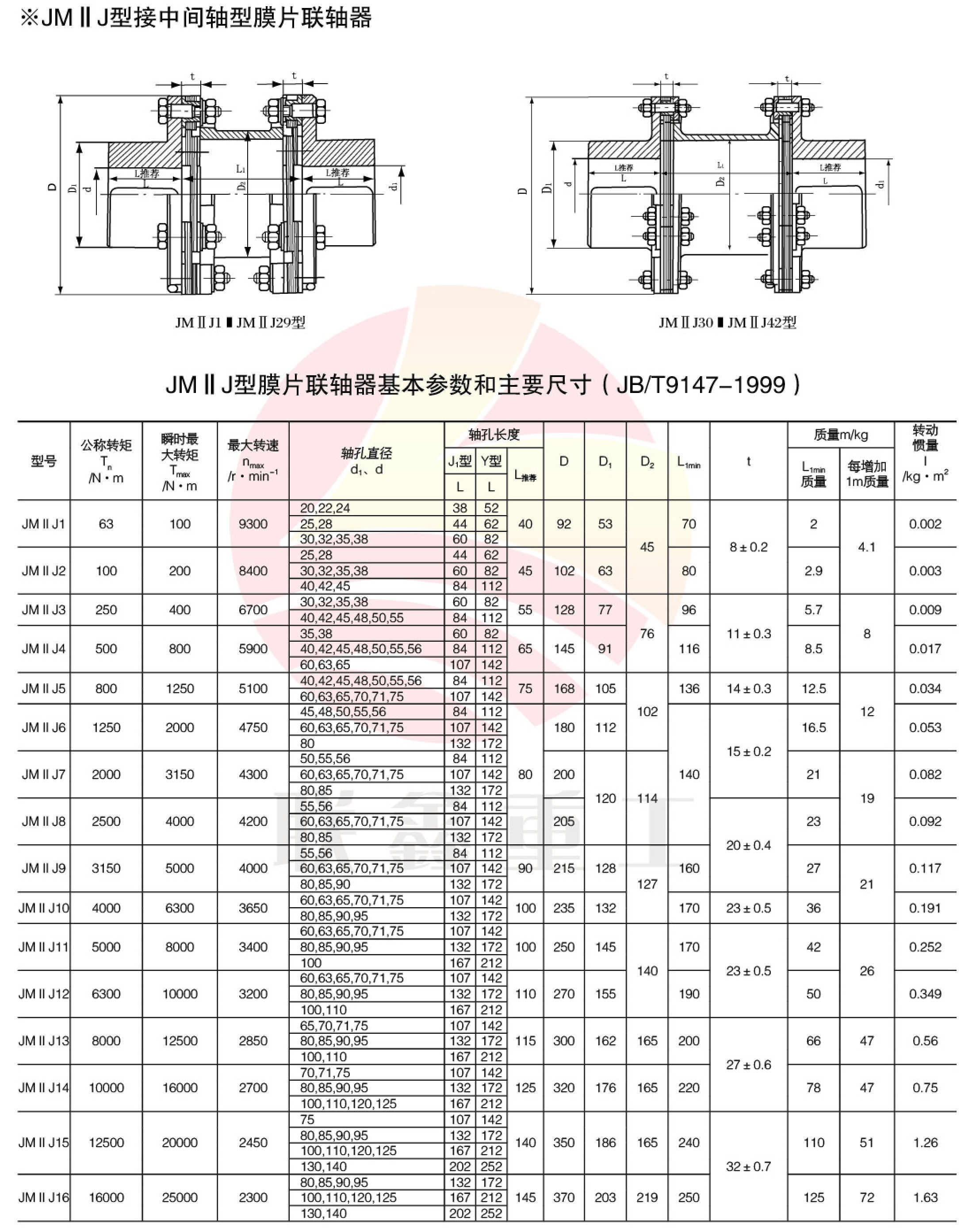 JMⅡJ膜片聯(lián)軸器 特點及應用場合:與金屬彈性元件撓性聯(lián)軸器相比,具有機械強度高,承載能力大、質量輕結構尺寸小、傳動效率和傳動精度高,可靠性好、裝拆方便等特點。適用于中、高速、大轉矩軸系傳動。與鼓形齒式聯(lián)軸器相比,具有無相對滑動,不需潤滑,使用壽命長、無噪聲、結構簡單等特點.可部分代替鼓形齒式聯(lián)輔器。不受溫度和油污影響。具有耐酸、堿,防腐蝕的特點??捎糜诟邷?、低溫和有油、有水和腐蝕介質的工況環(huán)境.適用于各種機械裝置載荷變化不大的軸系傳動,通用性極強,工業(yè)發(fā)達國家已普遍采用,是我國重點推廣應用的高性能撓性聯(lián)軸囂,高精度膜片聯(lián)軸器可用于高速工況。膜片聯(lián)軸器與齒式聯(lián)軸器相比,沒有相對滑動,不需要潤滑、密封,無噪聲,基本不用維修,制造較方便,可部分代替齒式聯(lián)軸器。膜片聯(lián)軸器在工業(yè)發(fā)達國家應用已很普遍,在實際應用中一般采用接中間軸型,以提高兩軸線偏移補償性能。