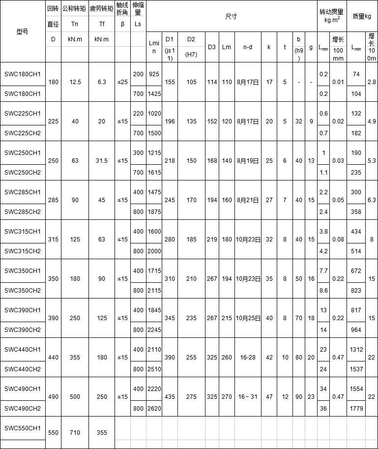 SWC-CH長(zhǎng)伸縮焊接式萬(wàn)向聯(lián)軸器基本參數(shù)與主要尺寸(JB/T 5513-91) mm